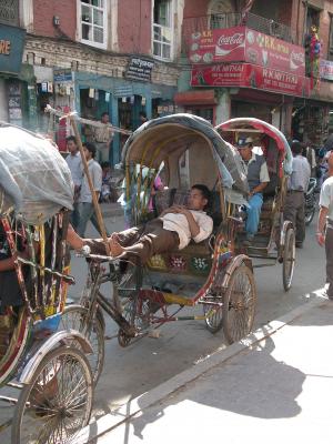 Waehrend unseren zwei Aufenthalten in Kathmandu, vor und nach dem „Trek“ , machten wir ausser Shopping auch noch etwas Sightseeing. Am Besten nimmt man sich ein Taxi, sollte den Fahrpreis aber immer im voraus abmachen und handeln. Soviel Taxi wie auf diesem Trip sind wir in unserem Leben noch nie gefahren , aber oft ist es die beste Moeglichkeit um von A nach B zu kommen. Die Taxis in Nepal sind noch kleiner als Fiat Panda, da die Strassen sehr eng sind. Somit war es draussen und drinnen eng, wenn wir zu viert in ein Taxi stiegen :-).