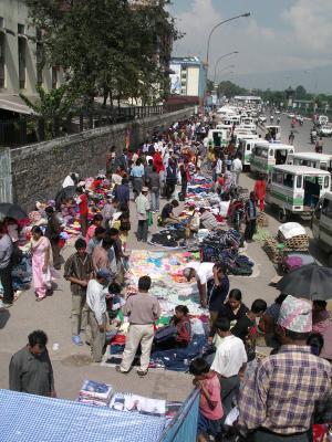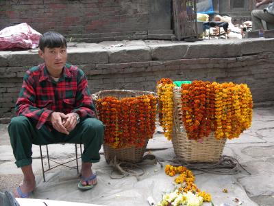 Einen weiteren Tag verbrachten wir damit, die Altstadt und den Durbar Square von Patan, dieser befindet sich etwas ausserhalb der City, zu besuchen. Somit ist dieser Teil weniger ueberlaufen als der Durbar Square mitten im Zentrum von Kathmandu. Wir nahmen uns Zeit und schlenderten durch die wunderschoenen Gassen und genossen die Ruhe ohne hektischen Verkehr verglichen mit Kathmandu. Auch der Durbar Square selbst ist groesser und imposanter als derjenige im Zentrum und ist viel weniger touristisch. Zudem hatten wir das Glueck, dass wir waehrend der Festivalvorbereitungen dort waren. Alles war voller Verkauefer: Gemuese und Fruechte wurden feil geboten, aber vorallem Enten und Huehner. Jeder Verkaeufer hatte mindestens vier Huehner oder Enten kopfueber in den Haenden bis er einen Abnehmer fand, der dann das Gefieder unter den Arm nahm und davon marschierte. Natuerlich versuchten wir, wie immer seit wir in Asien sind, nicht zu nahe an das Geschehen heran zu treten ,wenn wir Gefluegel sehen (Vogelgrippe), doch wir koennen euch sagen, dass ist nicht immer einfach, vorallem etwas auf dem Land draussen, da kommen einem Huehner auf der Strasse entgegen wie bei uns Katzen oder Hunde. Aber es war wirklich eindruecklich das mal mit zu erleben.